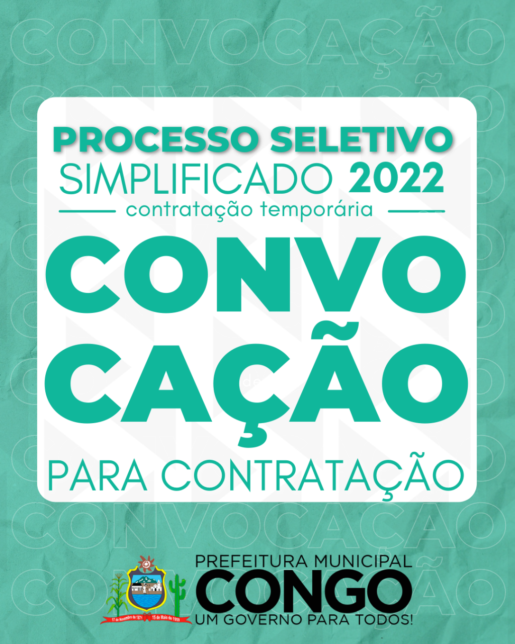 A Secretaria Municipal de Administração convoca, através do Processo Seletivo Simplificado de Contratação Temporária regido pelo Edital nº. 001/2022, os aprovados no Processo Seletivo, para comparecer à Secretaria Municipal de Administração, na sede da Prefeitura Municipal de Congo, localizado a Rua Senador Rui Carneiro, s/n, no período 08h às 12h e 14h às 17h, em até 48 horas (quarenta e oito horas) da data de publicação deste edital para assinatura de contrato.
