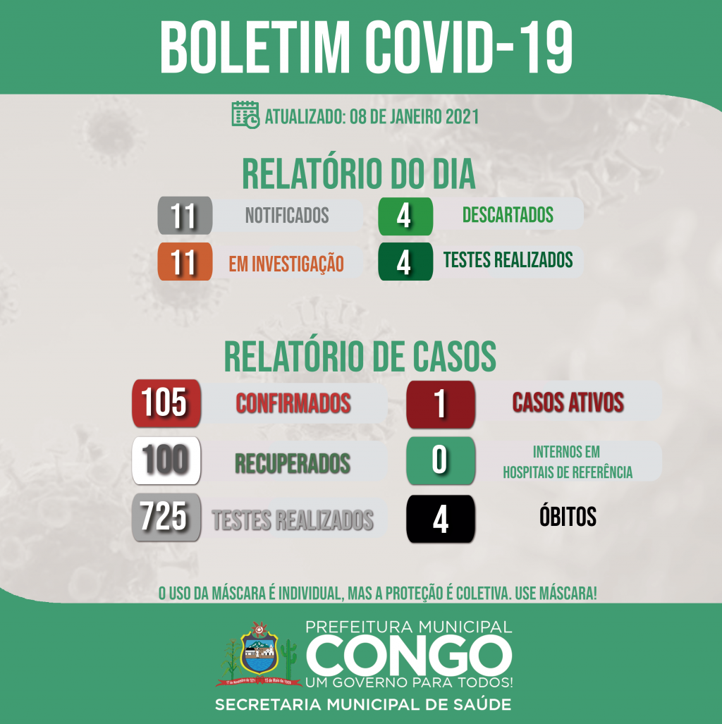 A Secretaria Municipal de Saúde do Congo informa que hoje, dia 8 de janeiro, não foi registrado nenhum caso de COVID-19 no município.