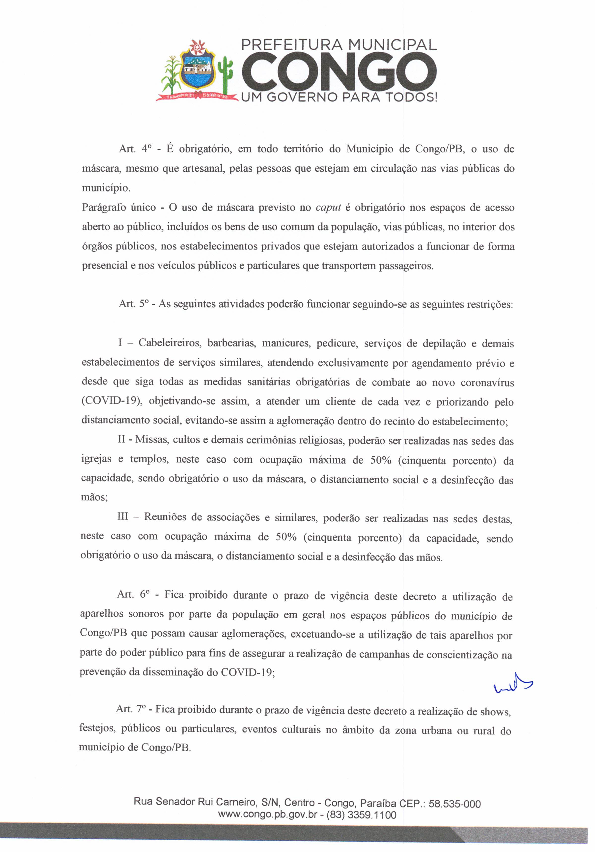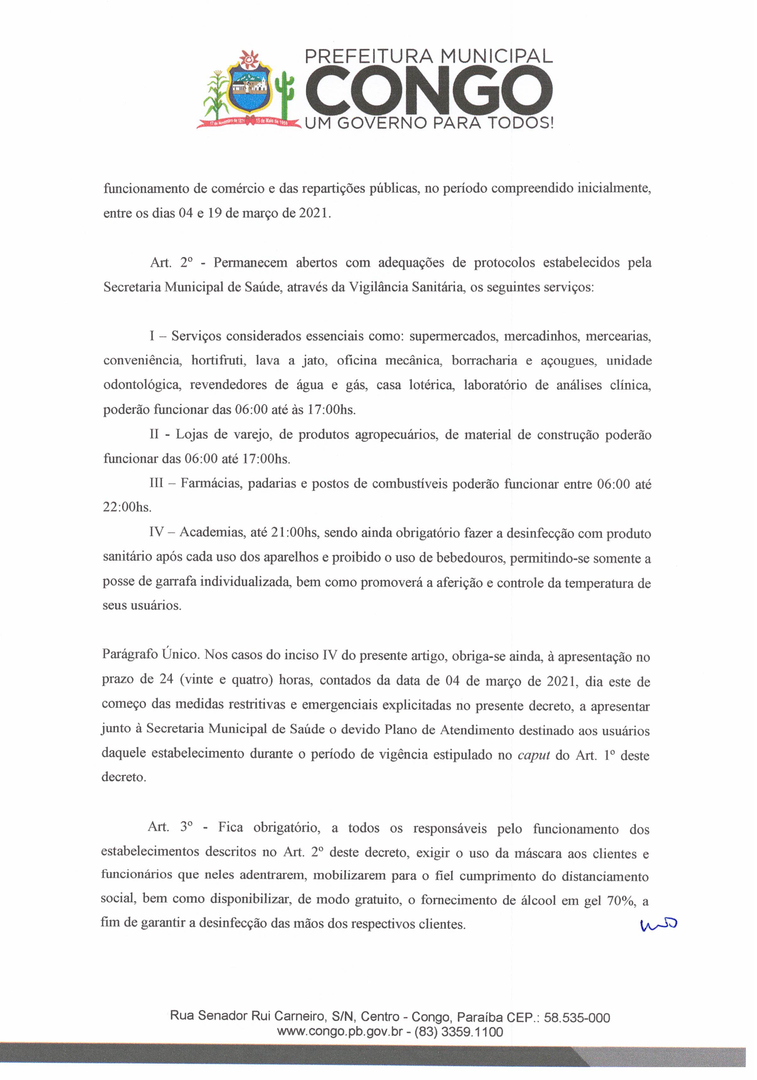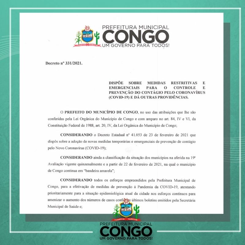 A Prefeitura Municipal de Congo, publica no dia de hoje um decreto com medidas mais restritivas de combate ao Covid-19 que estabelece regras para o funcionamento das repartições públicas, comércio, igrejas, eventos e atividades esportivas.