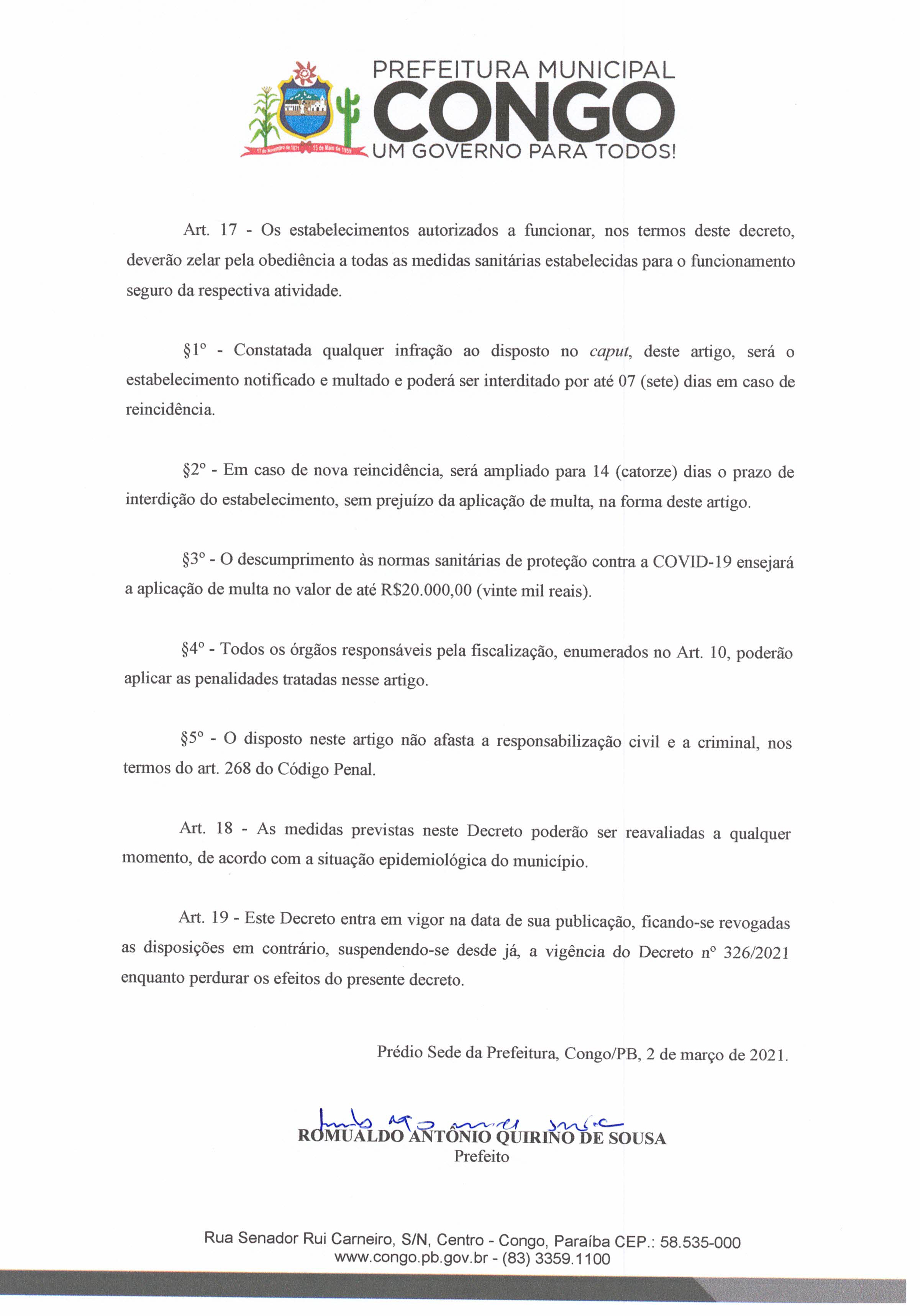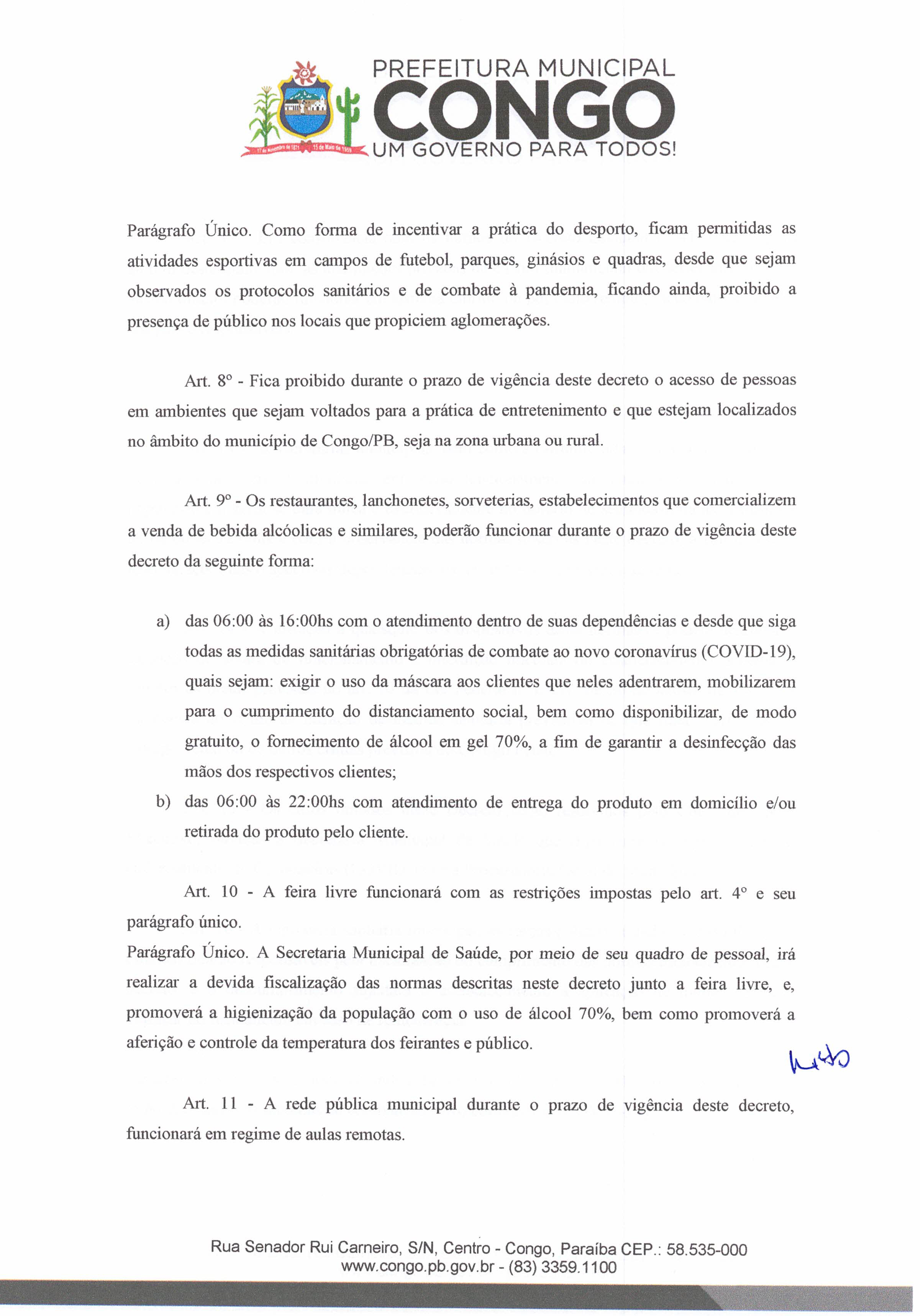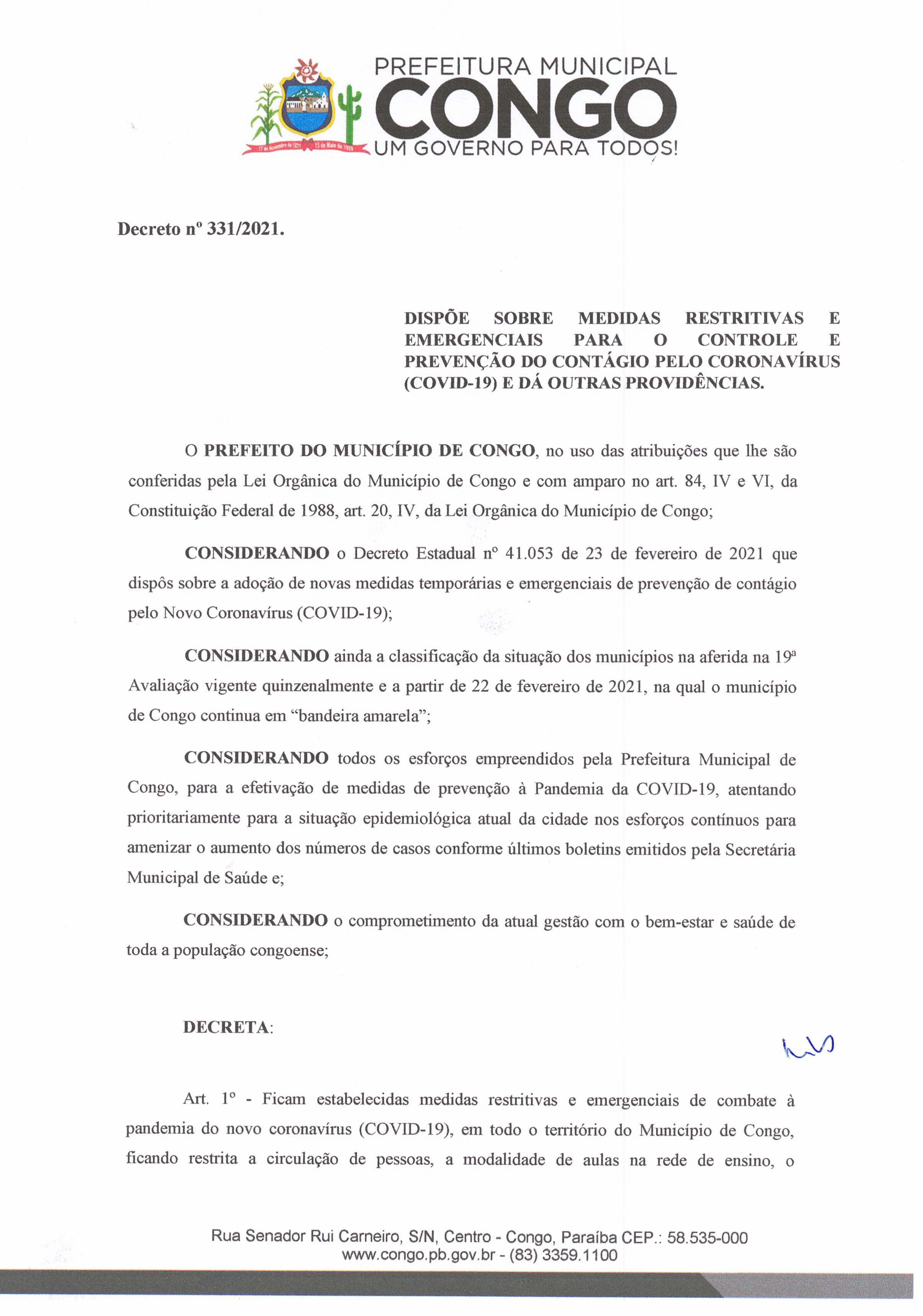 A Prefeitura Municipal de Congo, publica no dia de hoje um decreto com medidas mais restritivas de combate ao Covid-19 que estabelece regras para o funcionamento das repartições públicas, comércio, igrejas, eventos e atividades esportivas.