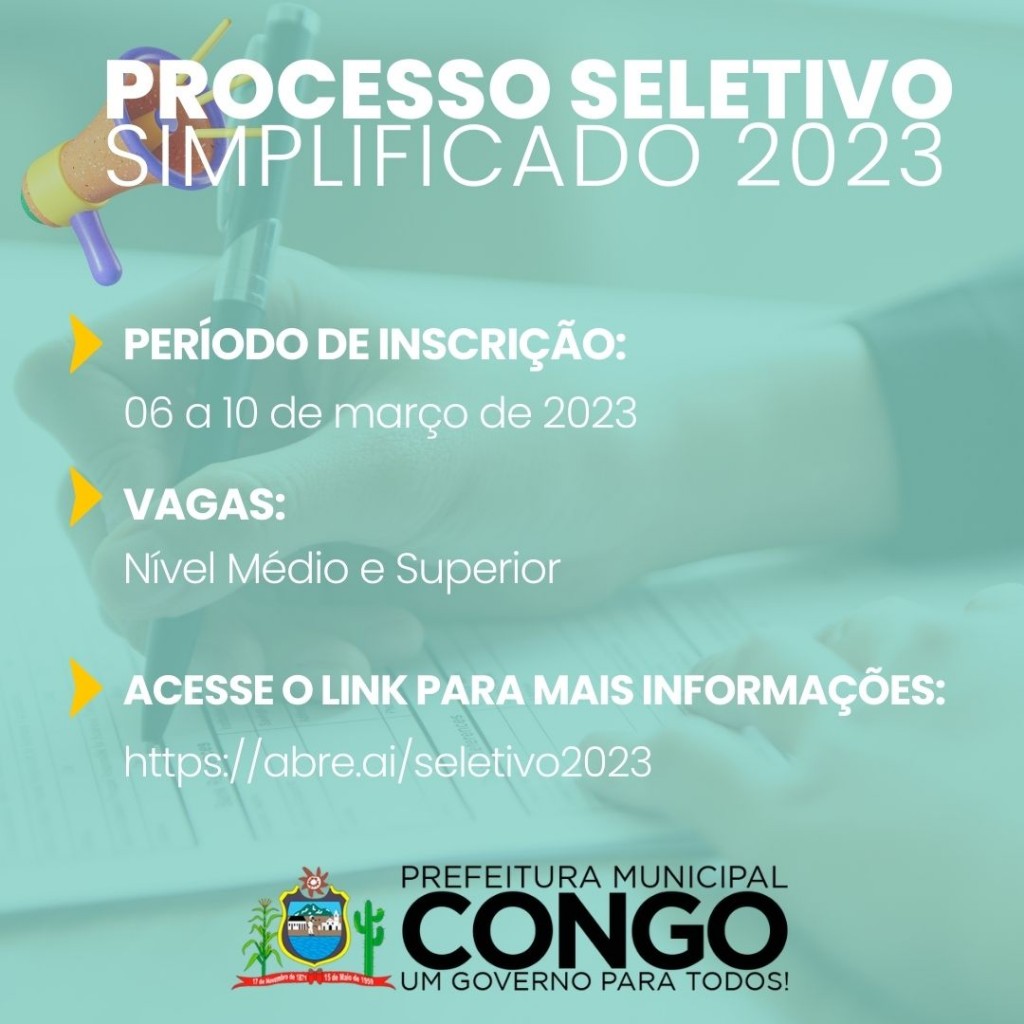 A Prefeitura Municipal de Congo-PB, através da Secretaria Municipal de Educação e Secretaria Municipal de Administração, e através da Comissão de Organização e Execução do Processo Seletivo Público, instituída pela Portaria Nº130/2023 torna público o EDITAL Nº001/2023, para contratação por TEMPO DETERMINADO, EM CARATER DE EXEPCIONAL INTERESSE PÚBLICO, para prestar serviço nas Escolas da Rede Municipal de Ensino de educação básica, do Município de Congo – PB, e pelas disposições regulamentares contidas no presente Edital e seus anexos.