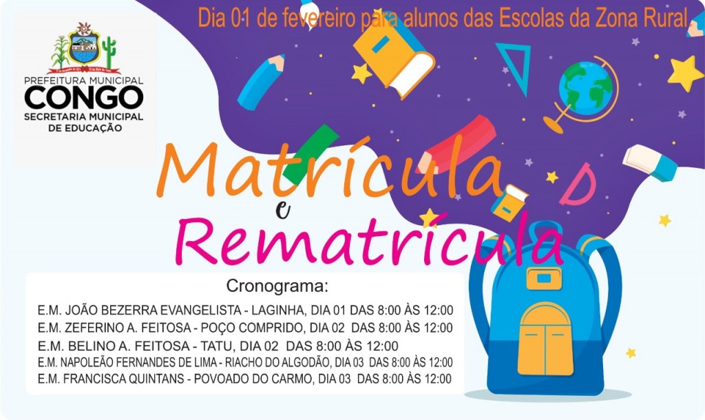 A prefeitura de Congo através da secretaria municipal de educação vem comunicar aos sr.(s) pais e/ou responsáveis que estará aberto o período de matrículas e rematrículas das escolas da zona rural. Segue abaixo o cronograma com as datas, locais e horário. Ainda em tempo ressaltamos a importância de seguir os protocolos sanitários para o controle da COVID-19.