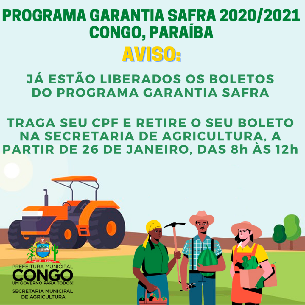 A partir do dia 26 de janeiro estarão liberados os boletos do Programa Garantia Safra do Congo.