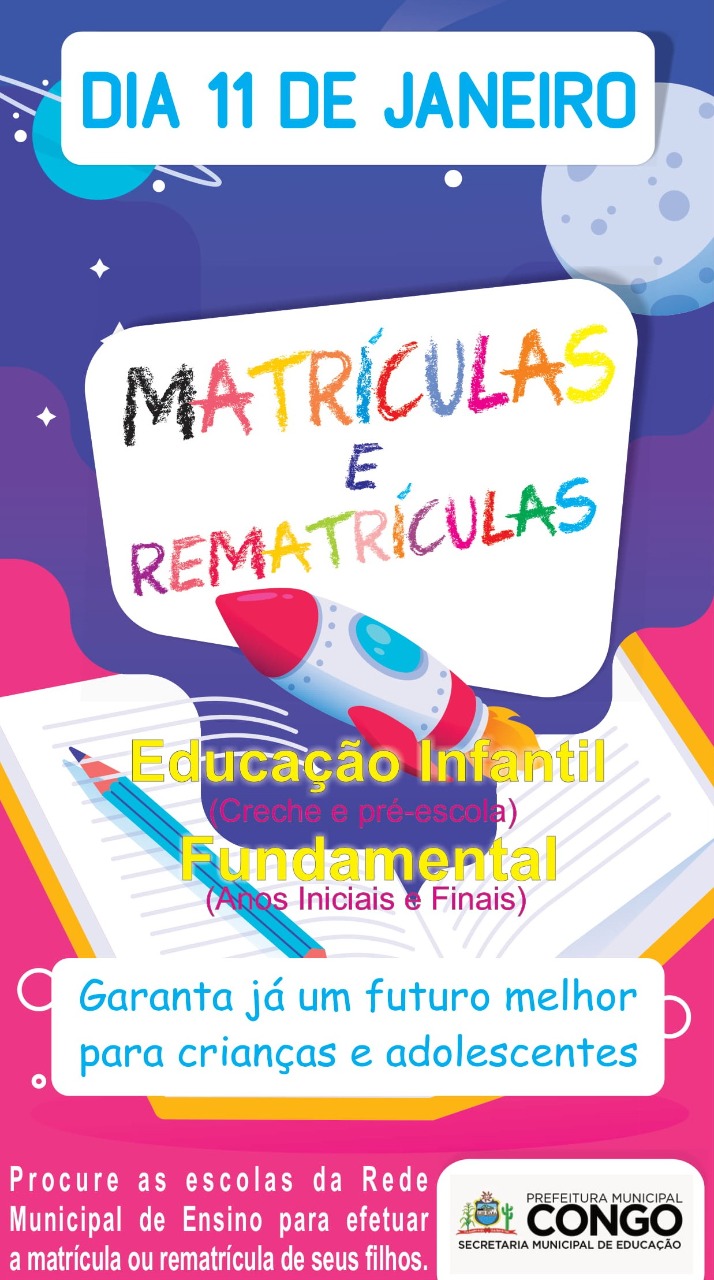 A Prefeitura de Congo, através da Secretaria Municipal de Educação convida os pais e/ou responsáveis para efetuar as matrículas e rematrículas dos alunos da educação infantil e do ensino fundamental.