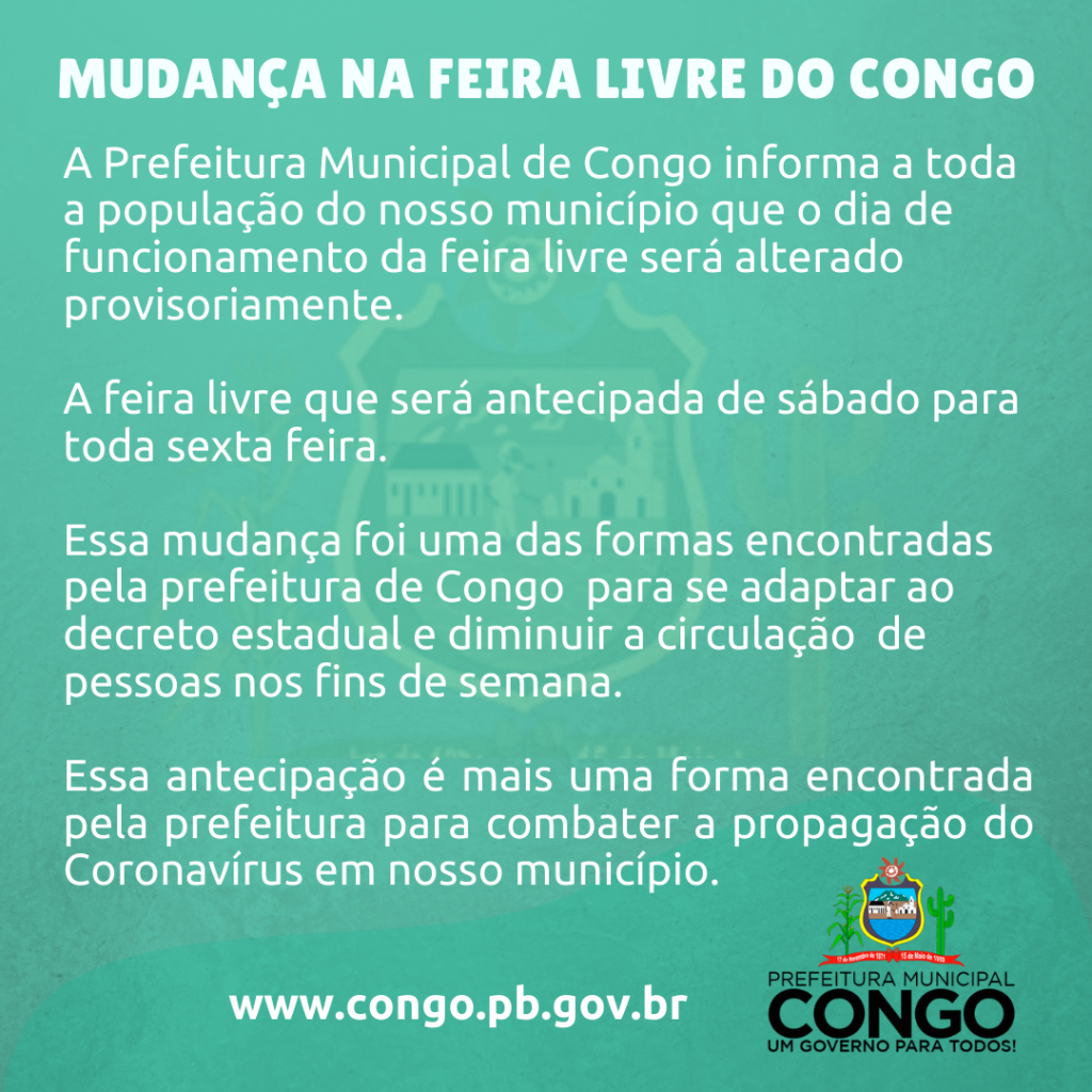 A Prefeitura Municipal de Congo informa a toda a população do nosso município que o dia de funcionamento da feira livre será alterado provisoriamente.