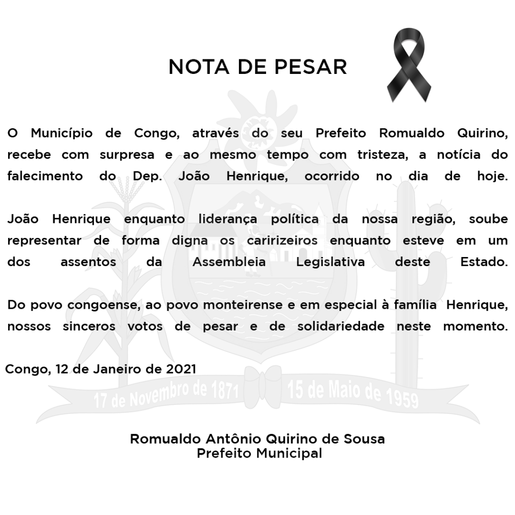O Município de Congo, através do seu Prefeito Romualdo Quirino, recebe com surpresa e ao mesmo tempo com tristeza, a notícia do falecimento do Dep. João Henrique, ocorrido no dia de hoje.