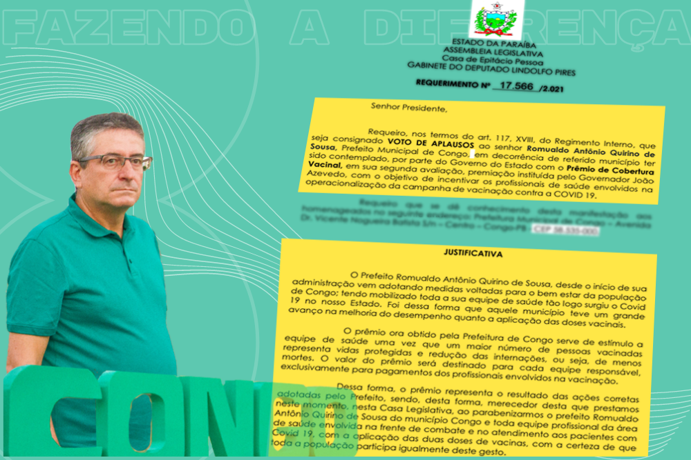 O Prefeito Romualdo Quirino recebeu VOTO DE APLAUSOS da Assembléia Legislativa do Estado da Paraíba em decorrência de município do Congo ter sido contemplado, pelo Governo do Estado com o Prêmio de Cobertura Vacinal. A premiação instituída pelo Governador João Azevedo, tem o objetivo de incentivar os profissionais de saúde envolvidos na operacionalização da campanha de vacinação contra a COVID-19.