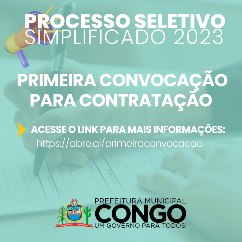 A Prefeitura Municipal de Congo divulga a primeira convocação para contratação dos aprovados no Processo Seletivo Simplificado-2023, edital 001/2023.